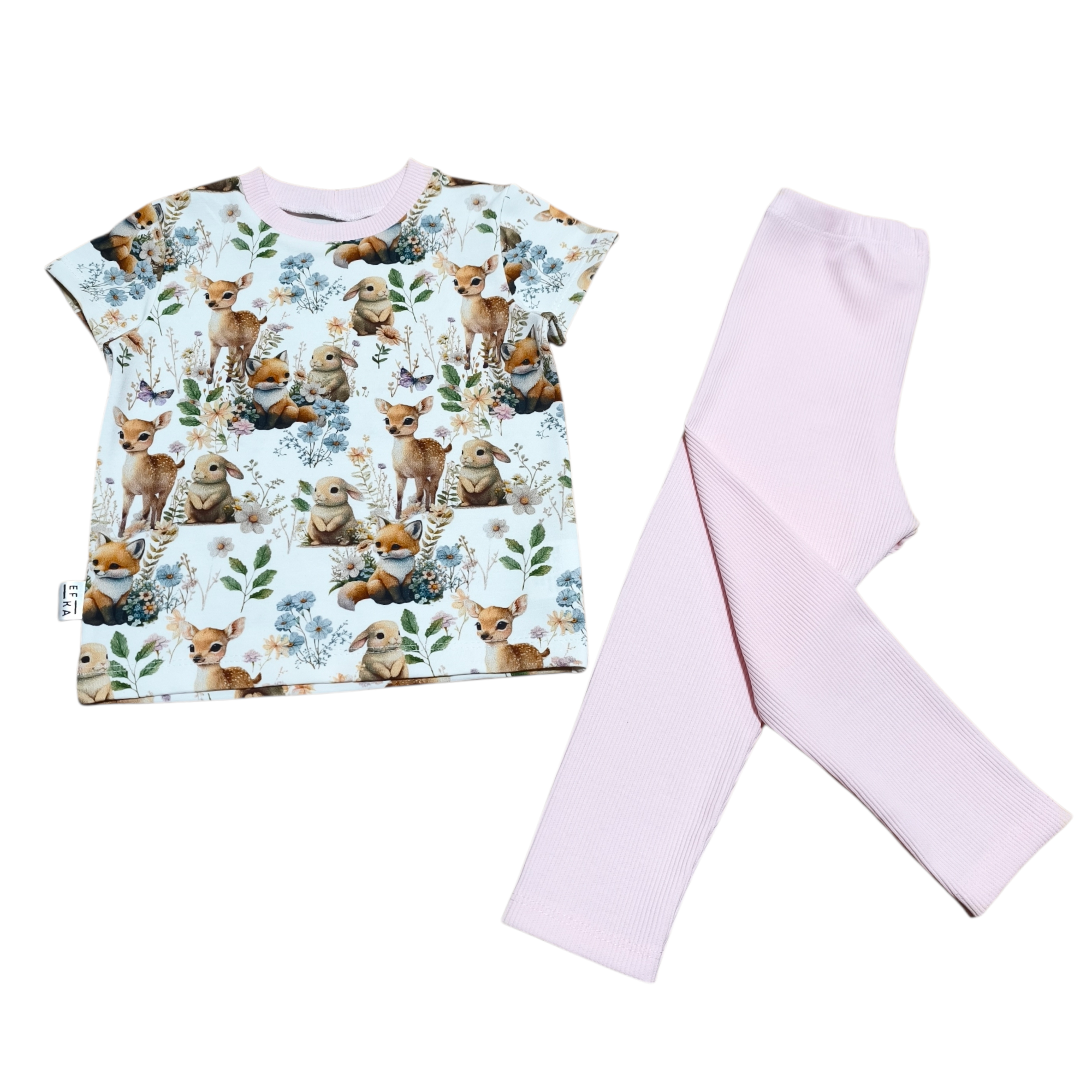 Komplekti kuuluvad pehmest ribilisest trikotaazist retuusid ning mugav tsärk, mis sobib ideaalselt nii mängimiseks kui ka igapäevaseks kandmiseks.